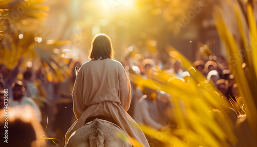 Jesus on Palm Sunday, on a donkey, received by the crowd