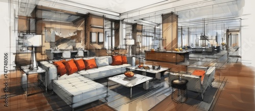 This drawing depicts a contemporary living room featuring plush couches and sleek tables. The design showcases a harmonious layout with carefully placed furniture.