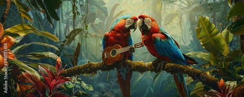 A duo of parrots with miniature guitars perched on a branch playing a duet under the canopy of a lush rainforest