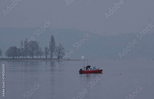 Bodensee, Fischer mit weisser Flagge im Nebel bei Konstanz