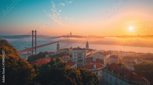 Sunrise over Historic Lisbon, The warm sunrise casting a golden light over the traditional architecture of Lisbon.