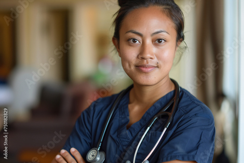 A woman dressed in scrubs, ready for medical examination or auscultation. She appears focused and professional.