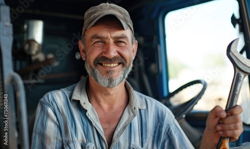 A cheerful man with a rugged face and a hint of mischief in his smile holds a trusty wrench, ready to tackle any challenge on the busy city streets.