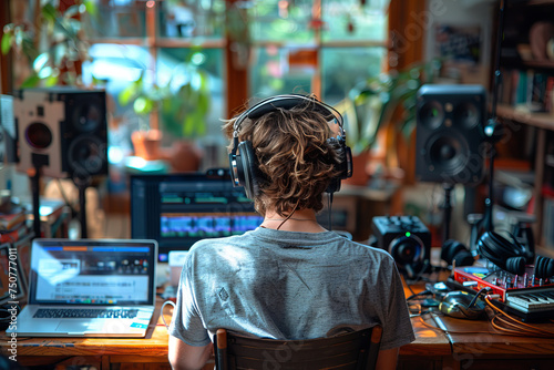 翻訳の結果 A rear view of a very popular influencer who broadcasts live broadcasts such as podcasts and YouTube using microphones and laptops in the studio. Internet live streaming concept.