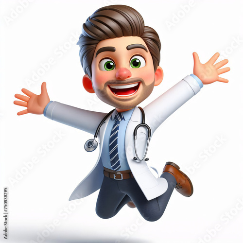 Energetic 3D doctor character jumps with joy, cartoon design, vivid colors, exaggerated characteristics, cheerful expression, textured details, concept art for animation, generative ai