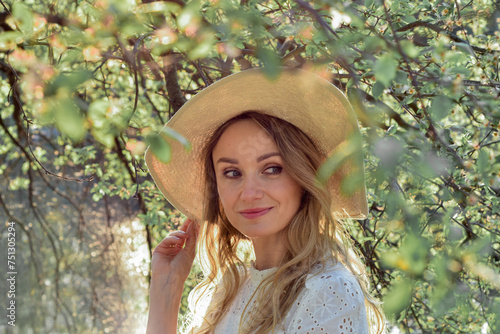 Wiosenny portret młodej ładnej kobiety w kapeluszu, w parku , wśród drzew.