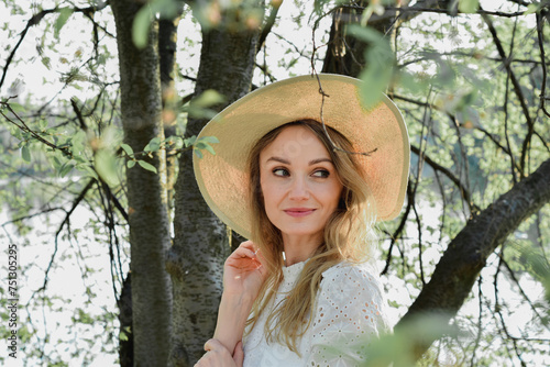 Wiosenny portret młodej ładnej kobiety w kapeluszu, w parku , wśród drzew.