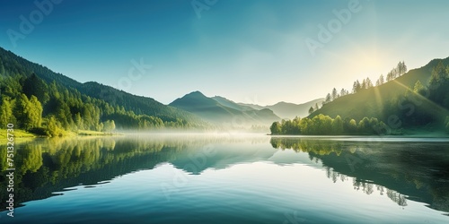 #1231239789A peaceful landscape featuring a serene sky with wispy clouds, majestic mountains, and a gentle flowing river bordered by verdant trees