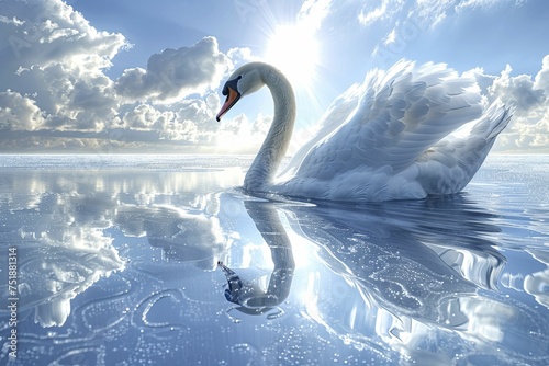 Tranquil 3D swan on a crystal lake background, reflecting elegance and beauty.