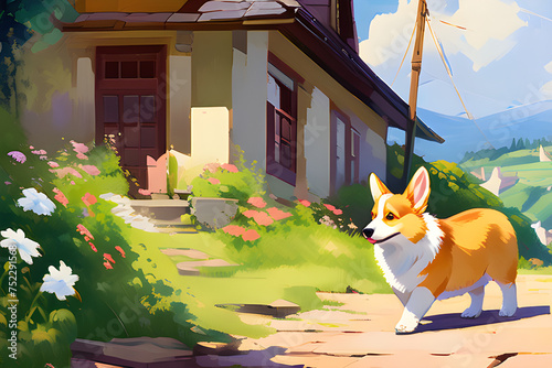 Welsh corgi taking a pleasant walk in a happy village. Generative AI