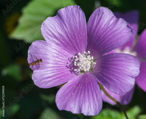 A purple anoda flower with a white center and a yellow bee on top of it.