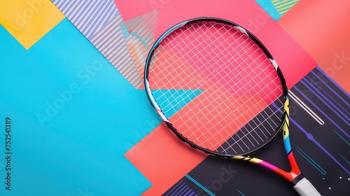 Na zdjęciu widać bliskie ujęcie rakiety tenisowej umieszczonej na barwnym tle wykonanym z geometrycznych wzorów.