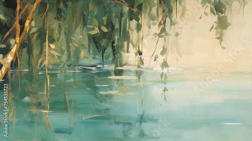 Green leaves of a weeping willow tree hang over a calm lake, painted in an impressionist style with soft brushstrokes.