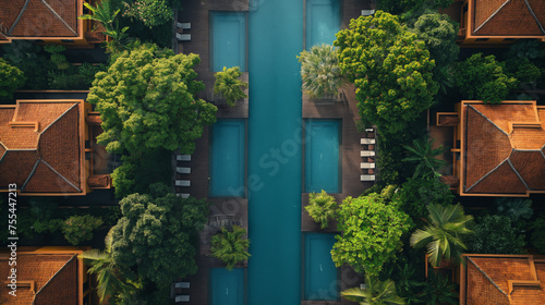 Luxury tropical hotel with a pool, scenic beautiful holiday vacation resort aerial view, touristic travel illustration