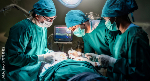 Professional Medical Doctors and team performing surgical operation in bright Modern operating room with lighting equipment in hospital.