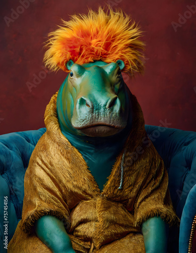 nilpferd, kunst, perücke, pelzmantel, mode, kampagne, close up, surreal, neu, modern, samt, barock, sessel, sitzend, menschlich, spaß, cartoons, cartoon, bizarre, karneval, design, copy space, karte,