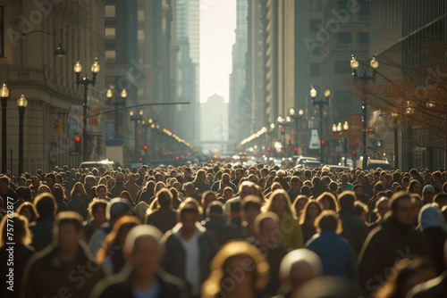Busy urban street scene with a crowd of pedestrians walking past tall buildings in the city