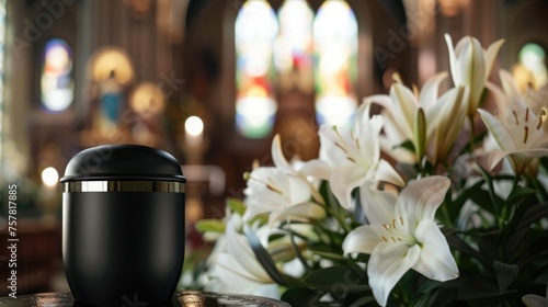 Stylish black urn with ashes among beautiful white lilies in the church. Farewell ceremony.