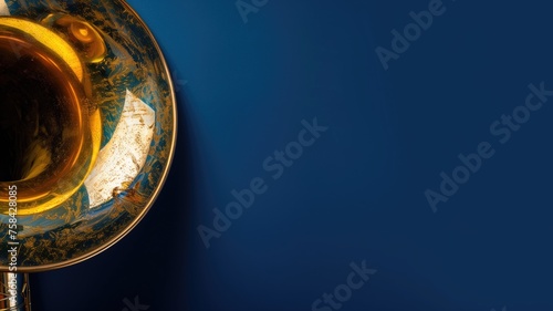 A trombone bell casts a golden reflection, creating a harmonious blend of music and visual art