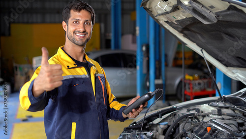 happy latin auto mechanic man checking electric battery voltage maintenance with digital battery tester gesturing show thumbs up and looking at camera in garage cars service . hispanic technician
