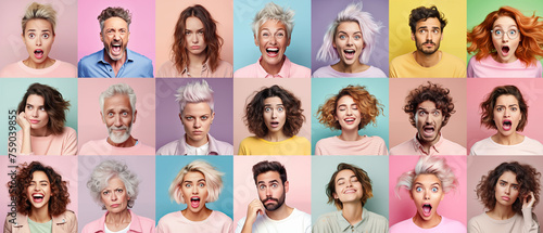 Collage of multicultural senior and young diverse people expressing different emotions. Human Reactions