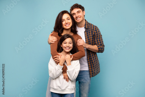 Healthy family relationship. Portrait of young dad and mommy embracing their daughter, standing on blue studio background