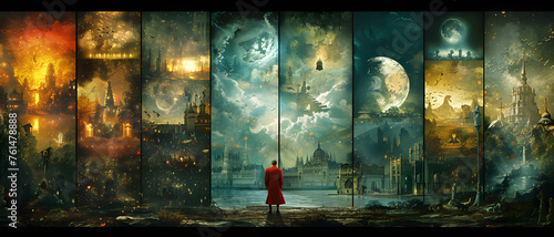 An individual stands before a wall of windows showcasing a spectrum of diverse and fantastical worlds