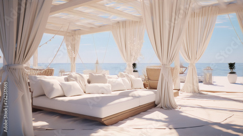3D rendering of a beach cabana with white curtains and pillows