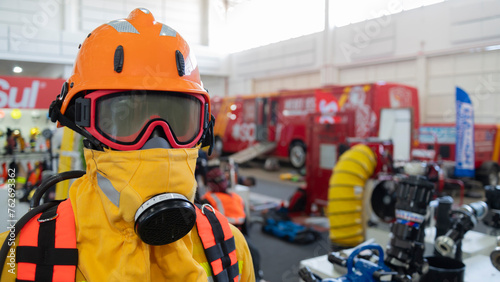 Bombeiro equipado com equipamentos de segurança contra incêndio e fumaça toxica.