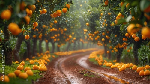 Dirt Road Lined With Orange Trees