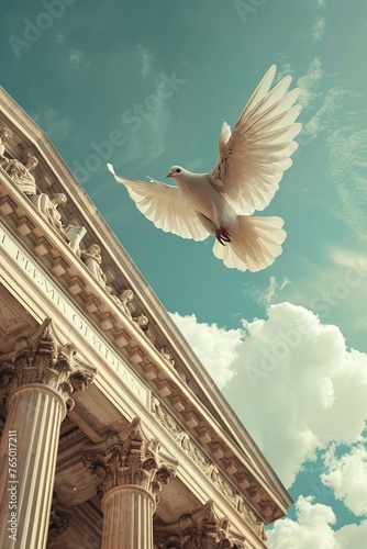 A dove flying over a courthouse, embodying the hope for peace and justice in society