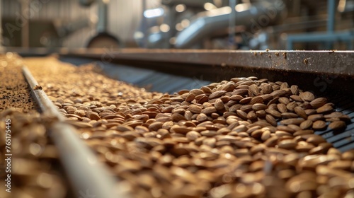 A conveyor belt filled with various nuts. Great for illustrating manufacturing or food industry concepts