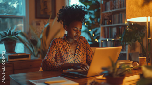 The home office buzzes with productivity as a black woman sits at her desk, composing emails and crafting website posts, while a freelance girl focuses on her laptop for remote work.