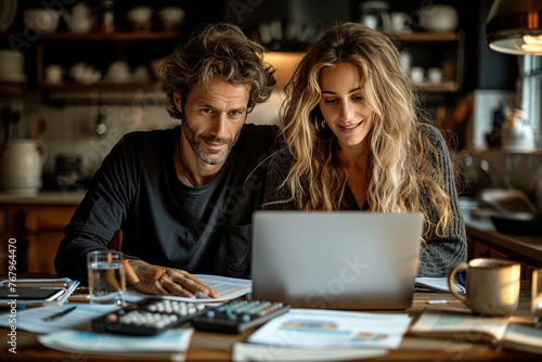 Caucasian couple sitting at a kitchen table, looking at a laptop screen, smiling, documents and calculator on the table