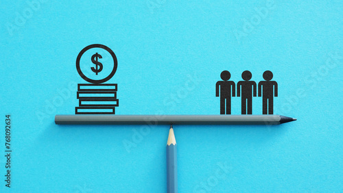 Social payments. Decent wages and Hired force. People and and coins of dollars on scales. Financially compensation for time and skills