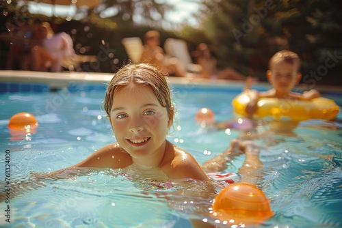 Cheerful young girl with blue eyes swimming in a pool, basking in the sunlight with splashes around her