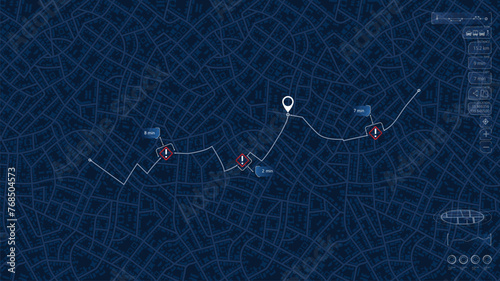 Closed turns on road, highway disruptions. Accident road. Traffic detours on map. Location tracks dashboard. Generic city map with streets and houses. Vector illustration