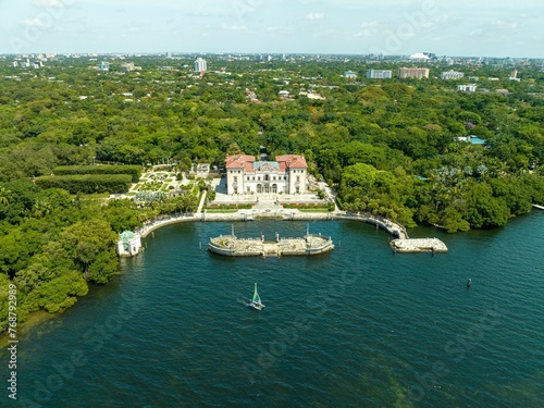a huge house surrounded by lots of trees and water and an island: The Vizcaya Museum and Gardens