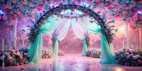 gala hall, flowers arch, wedding concept, magical atmosphere, pink-blue colors