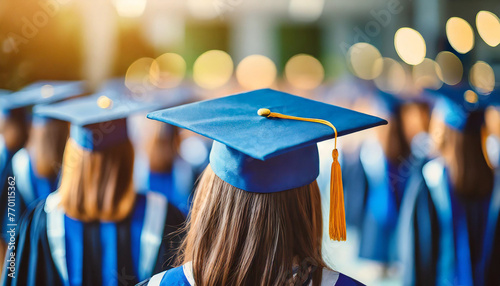 girl in blue and silver graduation cap, blonde and brunette high school gowns, symbolizing academic achievement and diversity