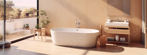 Bathroom interior with a large bathtub, plants, and a wooden vanity in a modern style with natural colors and materials