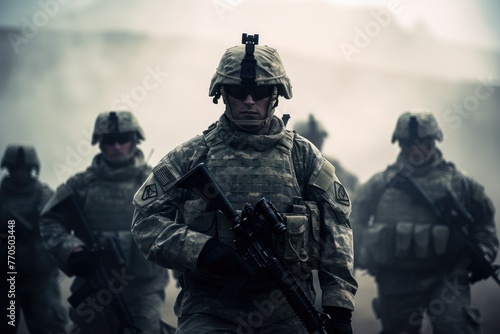 A group of Sentinels of Protection army soldiers are walking through a foggy field, their silhouettes barely visible in the mist. The atmosphere is mysterious and eerie. Generative AI