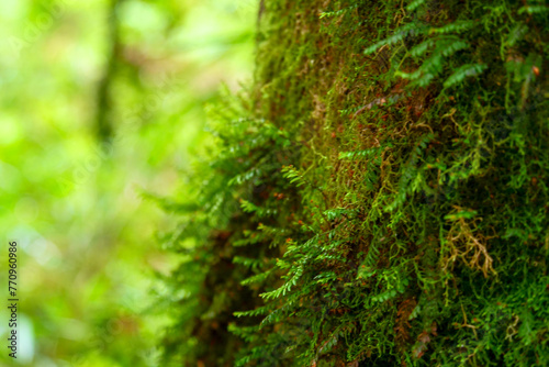 Green ferns growing off the side of a brown tree stump in a temperate forest. Background blurred or out of focus. Location: Ventisquero Yelcho trail, Corcovado National Park, Chile