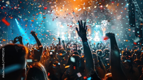 Energetic crowd at a music festival, enjoying the pulsating lights, confetti, and fireworks during the DJ's performance.