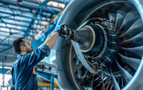 A technician in a blue uniform stands before a massive jet engine, inspecting it meticulously within an aircraft hangar.