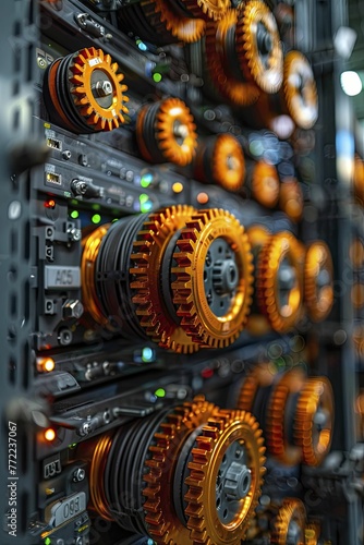 Abstract icon of a server rack with industrial gears as servers, on a data processing background, concept for the backbone of industrial IT.
