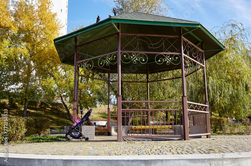 Rest area with bench in Kyiv, Europe. Place to rest in the city park. Rotunda or gazebo on the river embankment