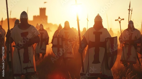 Warriors under the banner of the Knights Templar seek the Holy Grail as the sun sets merging myth with mission