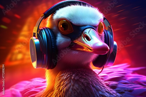 Close-up of the head of a funny goose wearing headphones under neon light, generated by AI