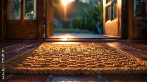 a welcome mat at a luxury front door during golden hour, Generative AI